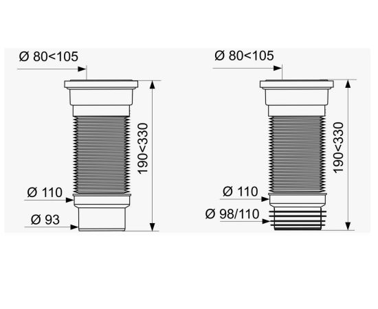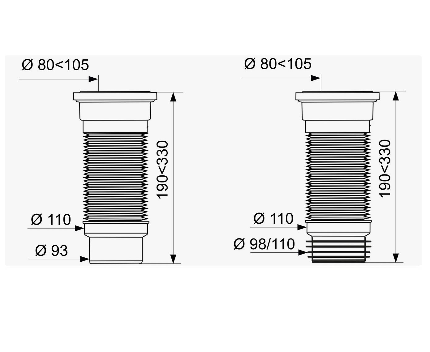 • диаметр подключения к унитазу — от 98 до 110 мм, к канализации — от 80 до 105 мм;