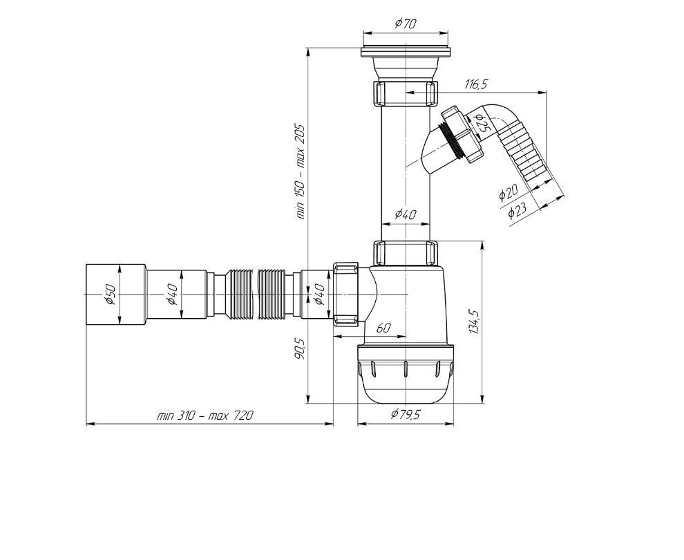 • длина гибкой трубки — 310–720 мм;