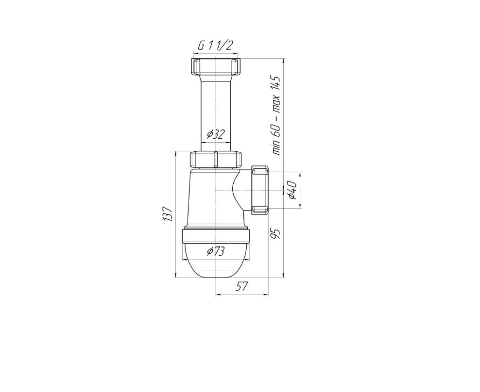 Сифон АНИ пласт C0120 бутылочной формы применяется для моек, без выпуска. Общая высота сифона варьируется от 60 до 145 мм, присоединительный размер 1.1/2" (40 мм). Выход для подключения к канализации 40 мм.