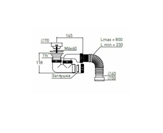 • Размеры гибкого соединения: длина L 800 мм, входное отверстие 40 мм, выход под канализацию 40/50 мм.