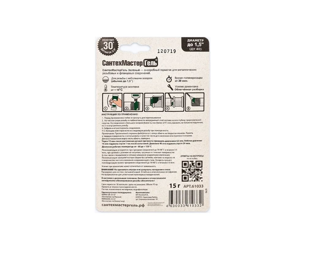 Гель СантехМастер Зеленый, тюбик 15 г, блистер 04013 — это резьбовой герметик для металлических соединений, созданный для легкого демонтажа соединений, которые располагаются в тяжело доступных местах, где невозможно использовать иные уплотнительные материалы. Он разработан для быстрой и качественной герметизации металлических фланцевых и резьбовых соединений.