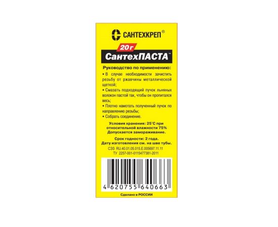 «СантехПаста 65г» от производителя «Сантехкреп» — универсальный уплотнительный состав для герметизации резьбовых соединений в системах отопления, бытового и питьевого водоснабжения.