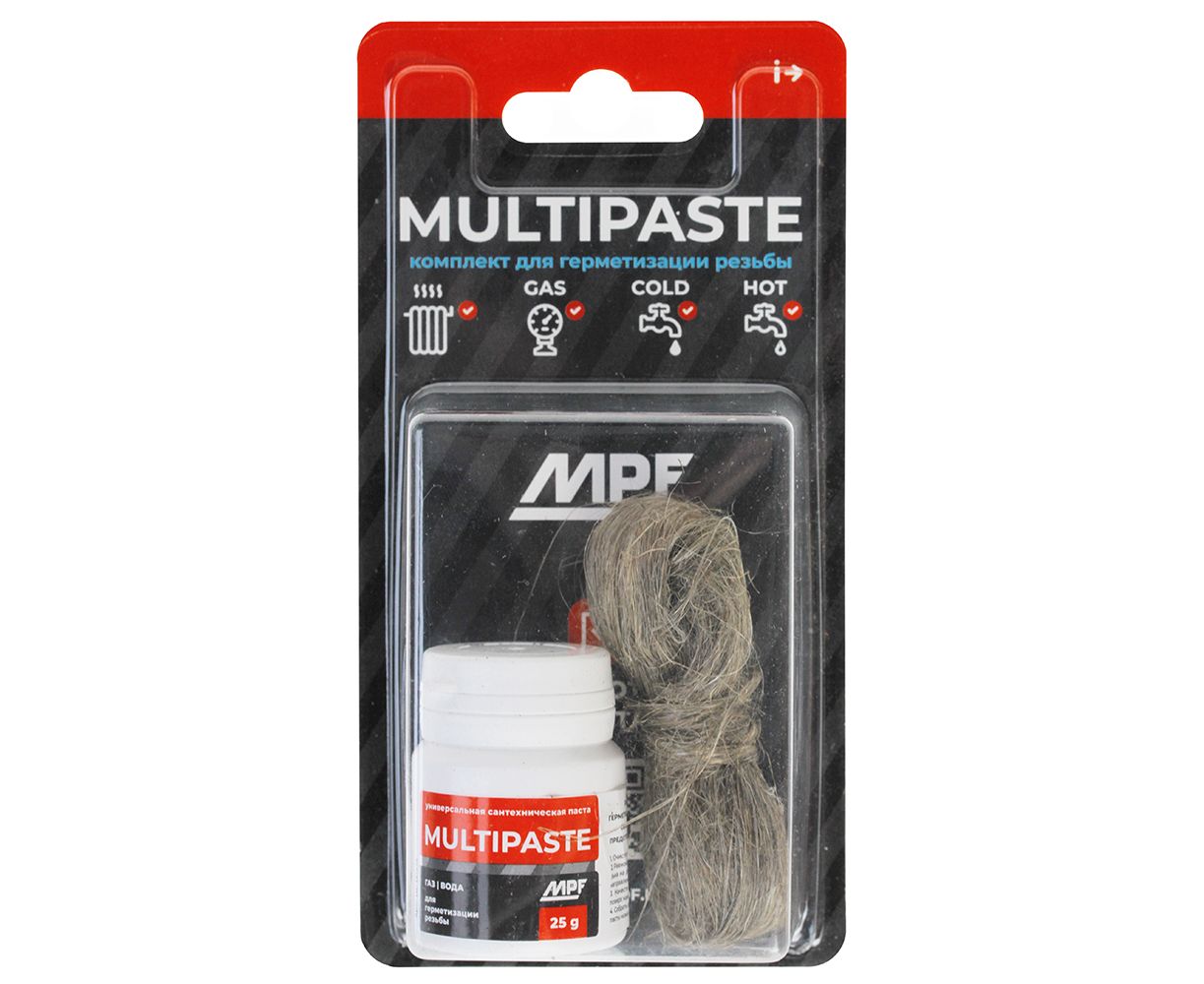 Комплект уплотнительной пасты MULTIPASTE и сантехнического льна (артикул ИС.131728) от бренда MasterProf — универсальный продукт для уплотнения резьбовых соединений в системах горячего и холодного водоснабжения, отопления, бытового газоснабжения.