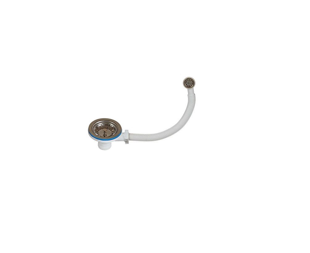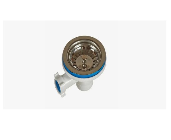 Выпуск ORIO А-5007-01 — пластиковый выпуск с нержавеющей чашкой диаметром 114 мм, решёткой, пробкой и резьбой 1 1/2" для кухонных моек со сливом диаметром 90 мм и круглым переливом