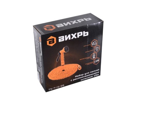 Набор для полива с растягивающимся шлангом 15м Вихрь состоит из растягивающегося латексного шланга длиной 15 метров, насадок для полива и крепления.