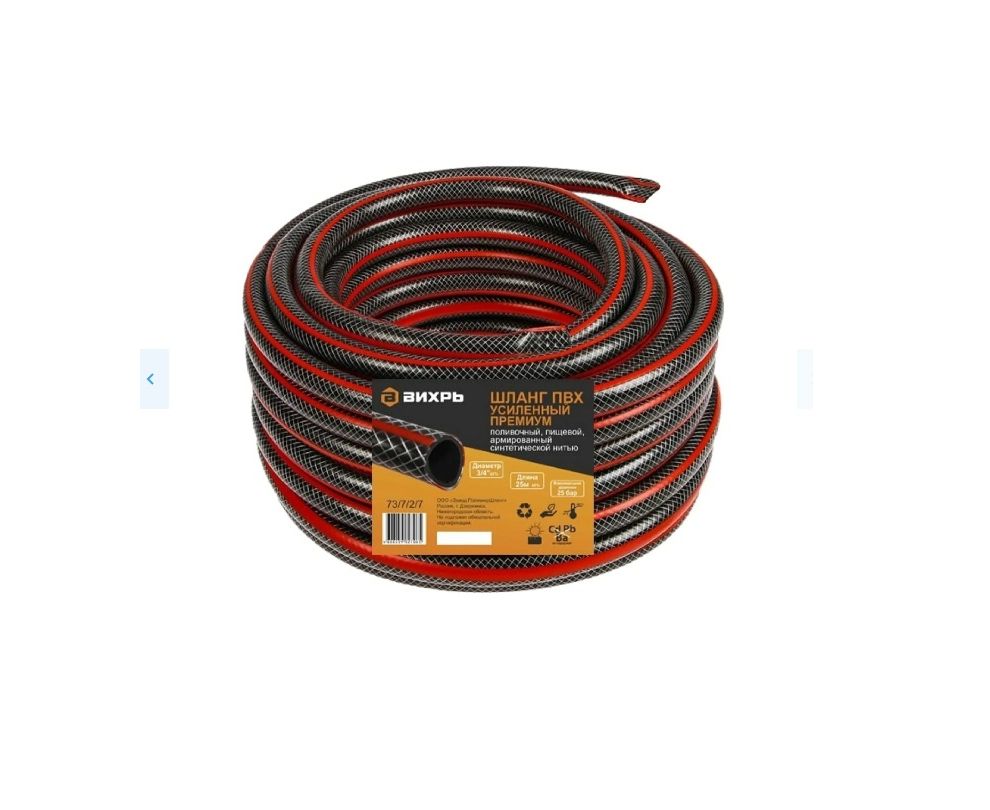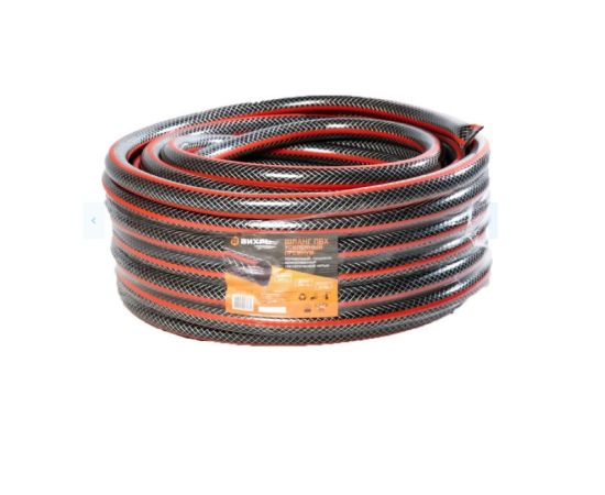 Надежный армированный черный/красный шланг от фирмы ВИХРЬ 73/7/2/7, следует использовать для орошения на садово-огородных участках и в обстоятельствах требующих водоподвода. Производится из первосортного ПВХ и имеет армирование. Это исключительно действует на прочность к перегибам, получается за счет новой технологии укладки полиамидными нитями.