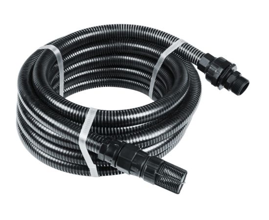 Шланг армирован пластиковой ПВХ-спиралью, обеспечивающей изделию гибкость и прочность. На одном конце шланга съёмный обратный клапан с сетчатым фильтром, наличие которого исключает возврат воды, на другом конце разборный соединительный фитинг для соединения с насосом.