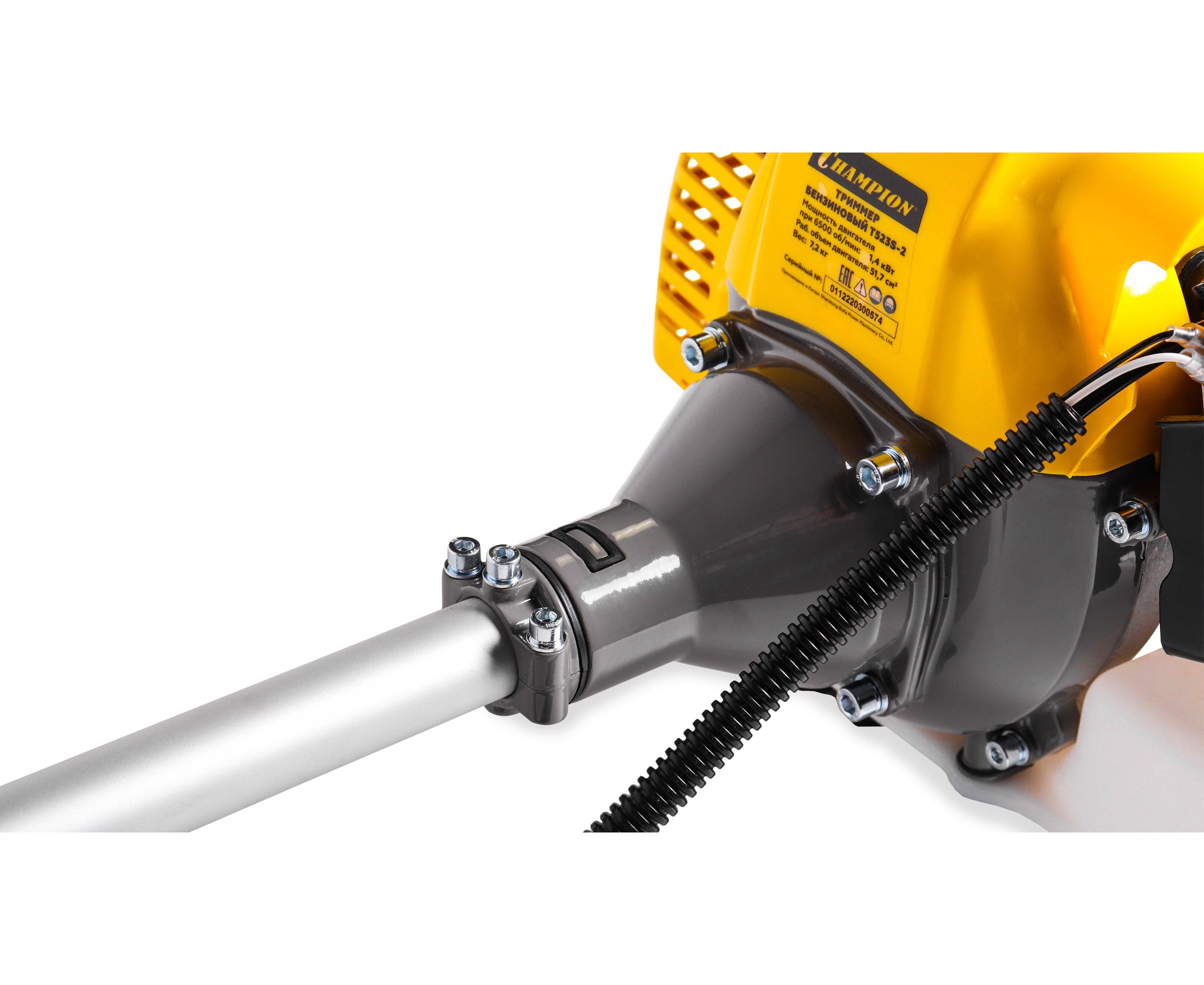 Champion Т523S-2 оснащен мощным двухтактным мотором, который запускается ручным стартером. Предусмотрено воздушное охлаждение. Агрегат работает на смеси из бензина марки АИ-92 и масла. Важно использовать масло, которое подходит именно для аналогичных двигателей. В момент запуска мотора впускной клапан открывается автоматически. Это позволяет выровнять давление и значительно сократить усилия, прилагаемые к тросу при его вытягивании. Триммер этой модели имеет очень прочный корпус. Такое изделие легко переносит даже значительные нагрузки. Для подачи горючего в карбюратор не придется прилагать много усилий. Такую ма