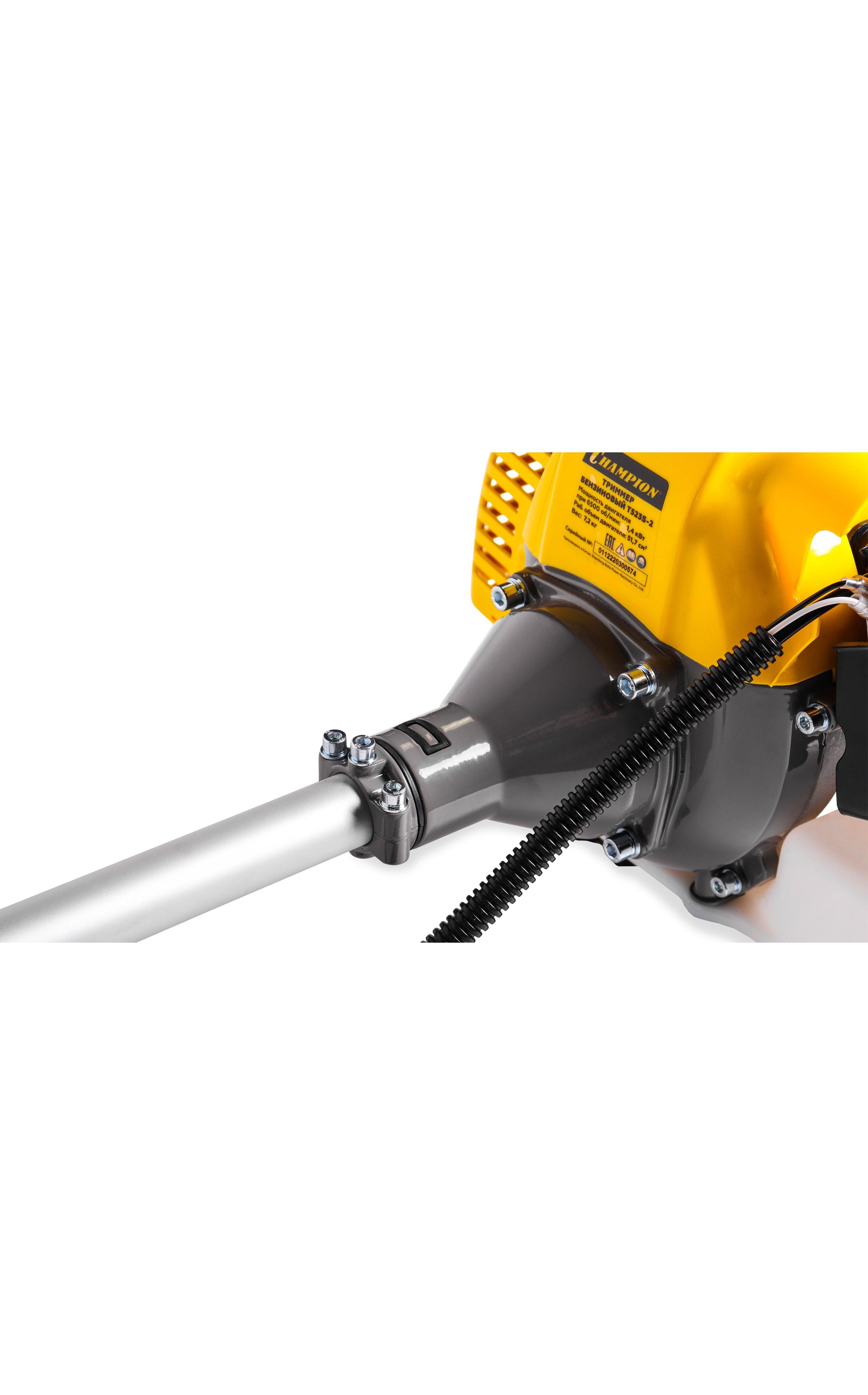 Champion Т523S-2 оснащен мощным двухтактным мотором, который запускается ручным стартером. Предусмотрено воздушное охлаждение. Агрегат работает на смеси из бензина марки АИ-92 и масла. Важно использовать масло, которое подходит именно для аналогичных двигателей. В момент запуска мотора впускной клапан открывается автоматически. Это позволяет выровнять давление и значительно сократить усилия, прилагаемые к тросу при его вытягивании. Триммер этой модели имеет очень прочный корпус. Такое изделие легко переносит даже значительные нагрузки. Для подачи горючего в карбюратор не придется прилагать много усилий. Такую ма